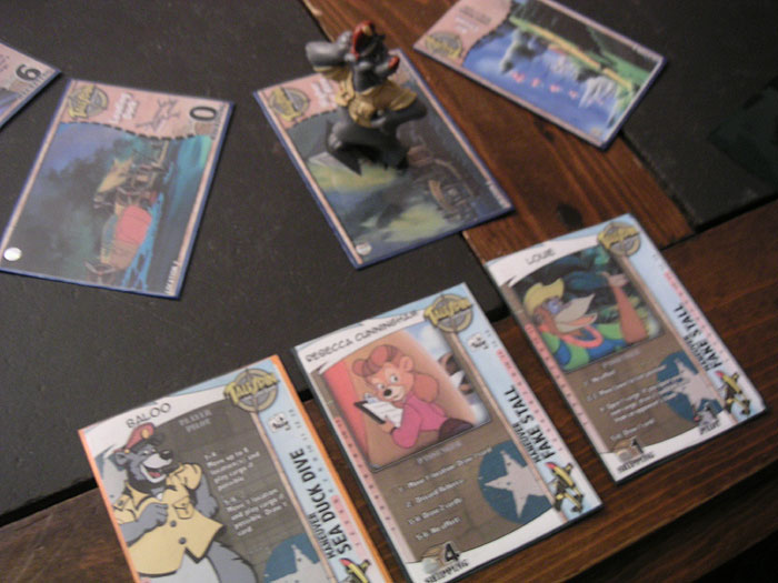A closeup of Baloo and his team. The Baloo Player card is in front, followed by the Passenger cards Rebecca and Louie. Each character card has a table showing effects according to a die roll. At the end of your turn, your roll the die and work down your line, following the instructions on the card. Your Passengers are often in flux; some will eventually discard themselves, and your opponents can take them or knock them out.