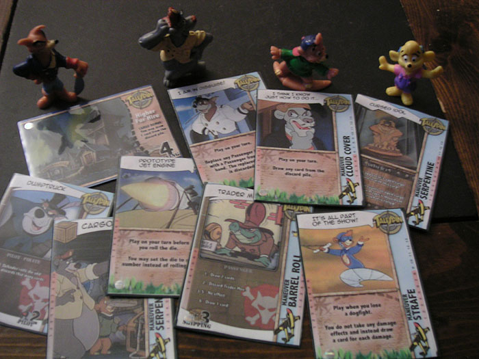Here's all four of the character figures and a random selection of card types. Top row: the "Higher For Hire" location card, "I Am In Disguise" action card, "I Think I Know Just How To Do It" action card, and "Cursed Idol" artifact card. Bottom row: "Dumptruck" pilot card, a Cargo card, "Prototype Jet Engine" action card, "Trader Moe" passenger card, and "It's All Part of the Show" action card. The images for the cards were mostly taken from screen captures of the actual cartoon.